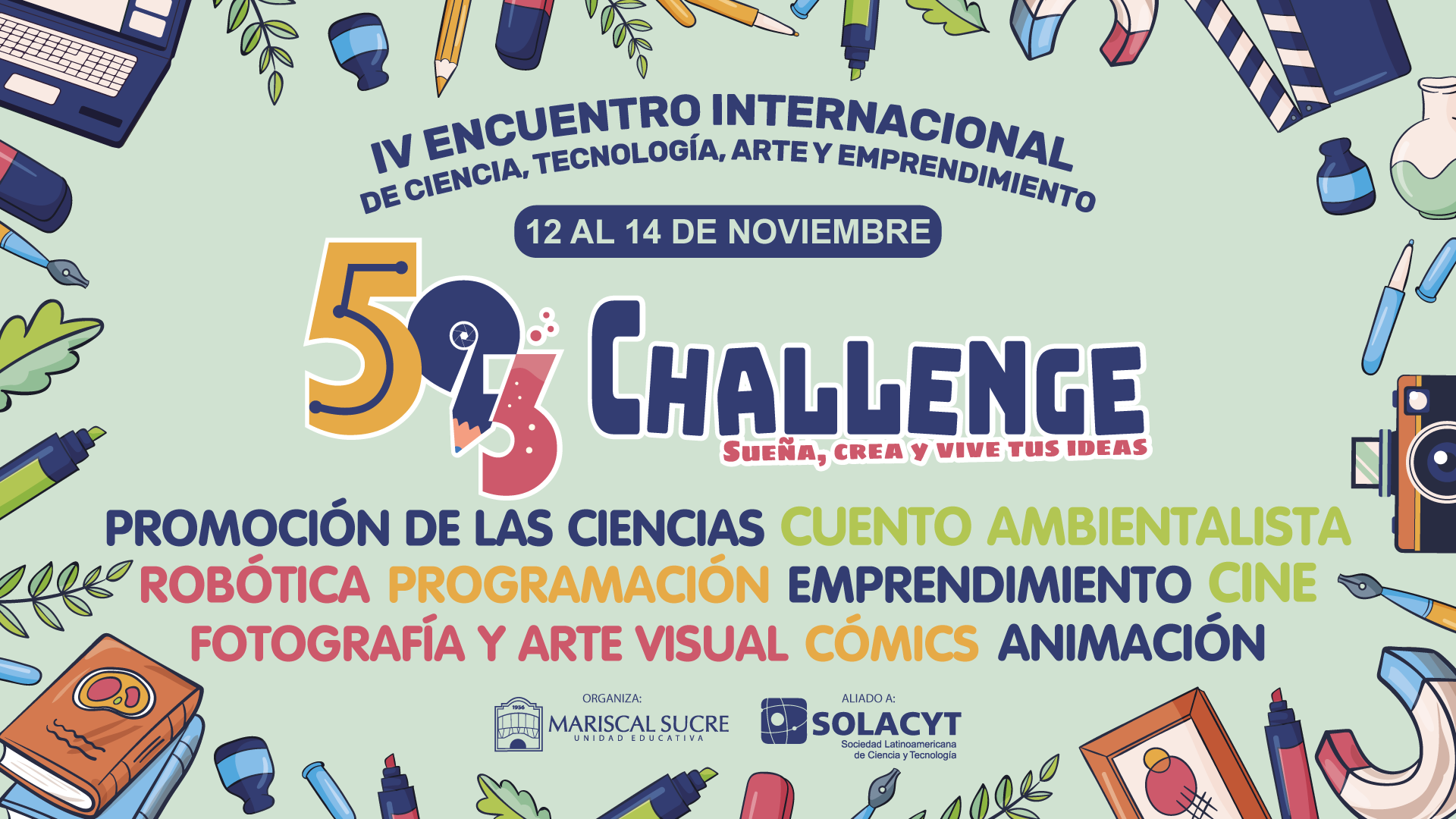 En la búsqueda de crear un espacio en el que jóvenes de nuestro país y del extranjero puedan compartir proyectos estudiantiles, la Unidad Educativa Mariscal Sucre convoca al III Encuentro Internacional de Ciencia, Tecnología, Arte y Emprendimiento 593 Challenge. Las categorías en las que podrán participar serán las siguientes: